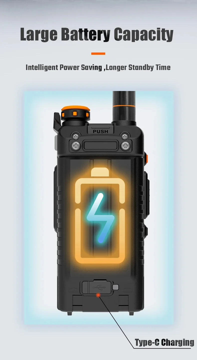 This long-range two-way radio supports VHF, UHF, AM aviation band reception, and FM broadcast radio, giving you flexible communication options in one compact device. The high-capacity 2500mAh lithium battery ensures extended use, while USB Type-C charging makes recharging easy anywhere in the UK, US, or worldwide.