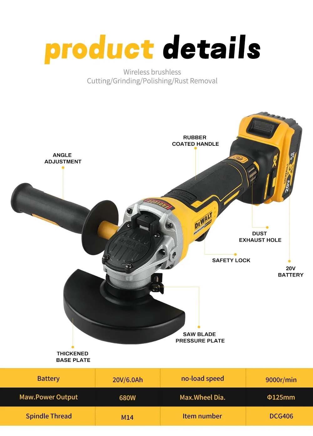DEWALT DCG406 20VCordless Angle Grinder:1000rpm125mm wheel,M14 spindle9000/min speed,680W power.For construction,DIY&industrial