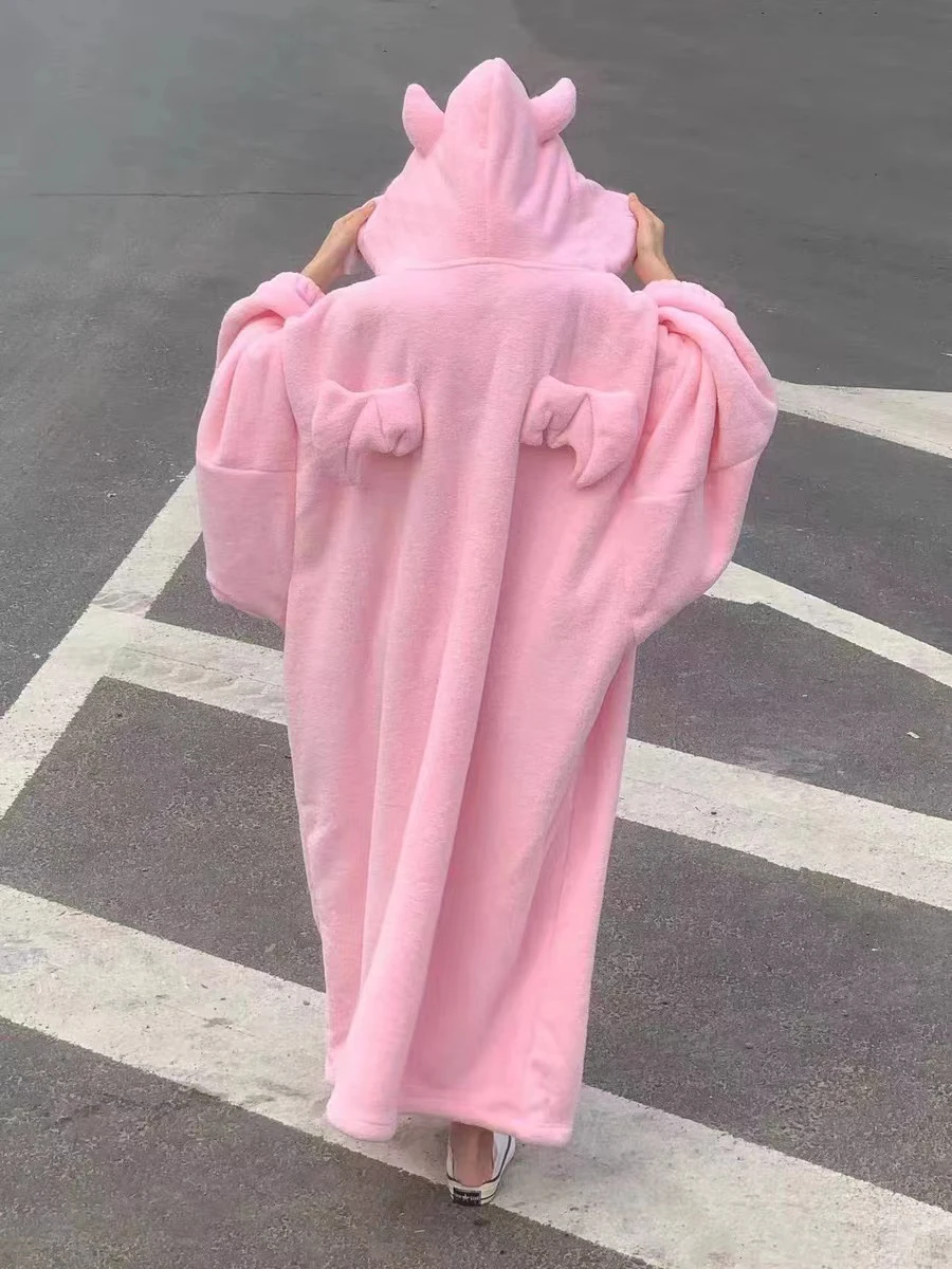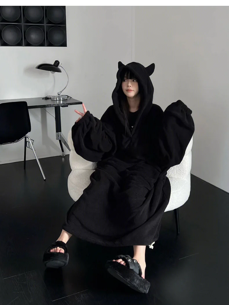 Ins Winter Thiened Coral Fce Pajamas Women's Spwear Hooded Fluffy Warm Nightgown Robe Long Sve Mid-Length Home Clo...