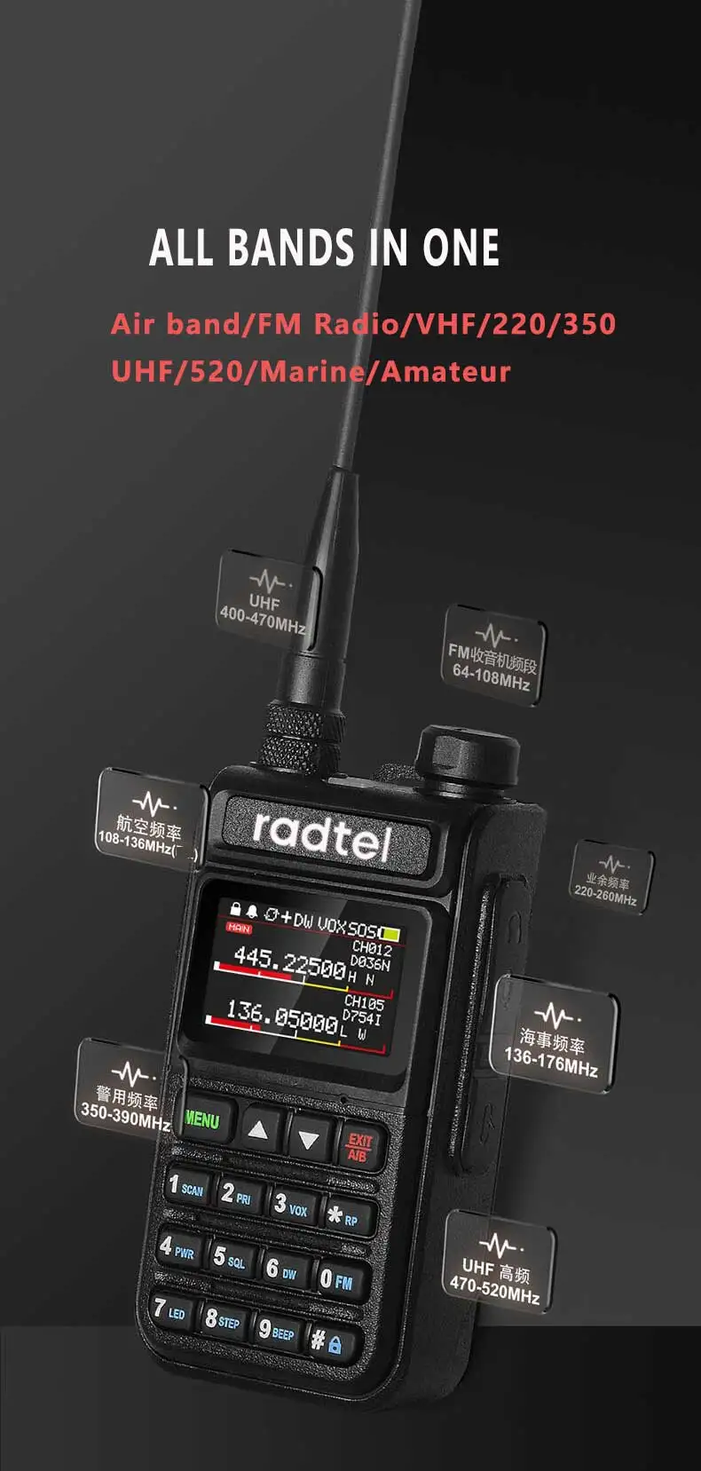 Radtel RT-890 Full Band Ham Radio Amateur 2 Way Radio 999CH Walkie Talkie AM Air Aviation Band Color Scanner Marine NOAA Scan