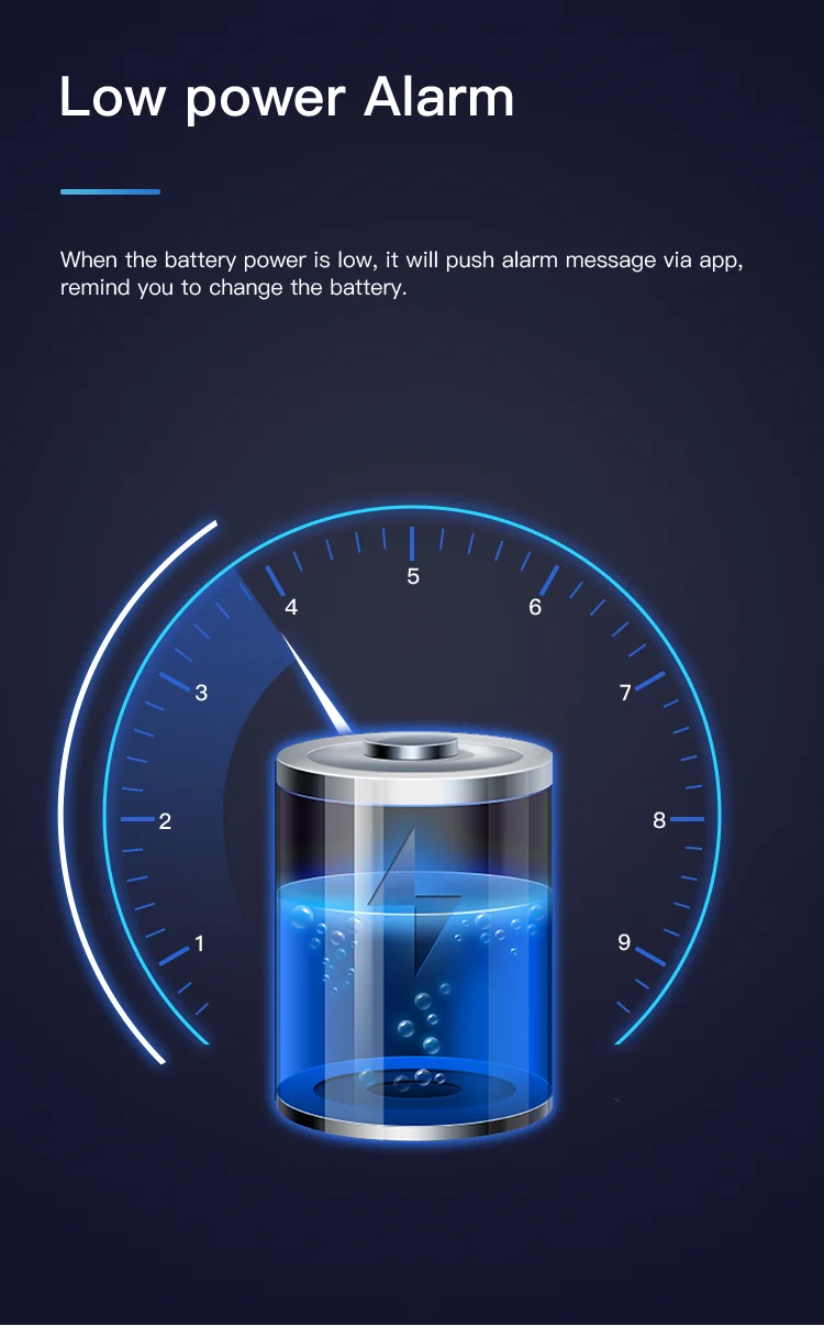 When the battery power is low, it will push alarm message via APP, Remind you to change the battery.
